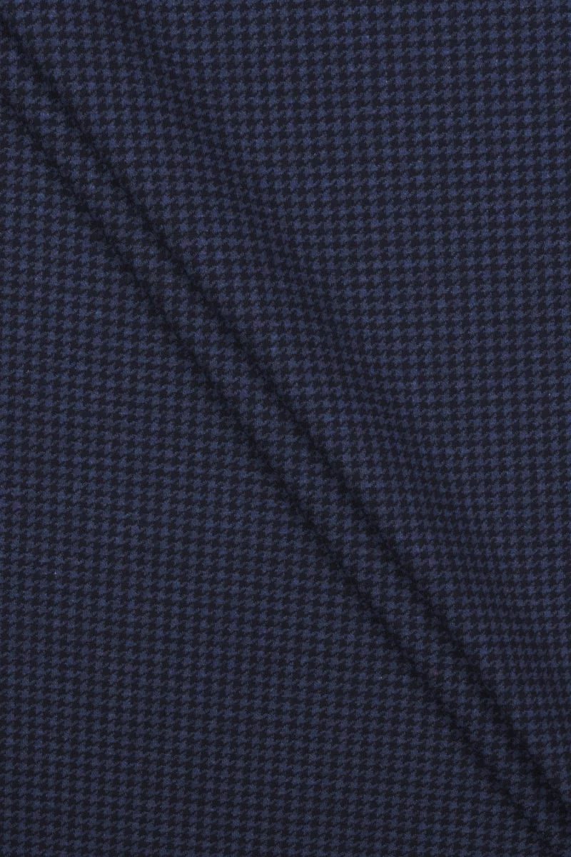 Taliansky džersejový úplet 100% vlna s čierno-námorníckym modrým motívom kuracích nôh (0,5 cm). Jersey tkanina je poťahová, jemne prehodená pletenina, ktorú je možné šiť bez podšívky.