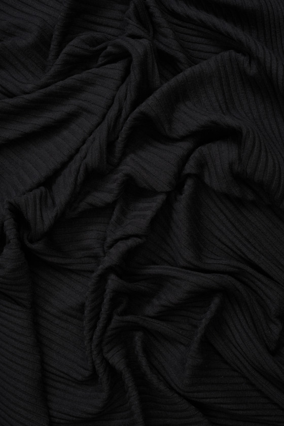 Taliansky úplet so širokou rebrovou väzbou (0,5 cm) v čiernej farbe. Mäkká, veľmi elastická, nepriehľadná, na dotyk príjemná pletenina - ideálna na šitie šiat, sukne alebo blúzky.