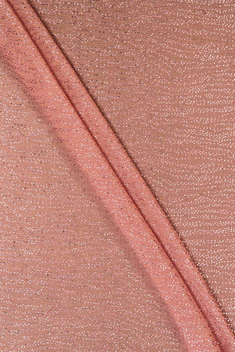 Talianska pletenina lososovej farby zdobená lesklými trblietkami. Pletená látka je veľmi tenká, priehľadná a jemne sa rúcha. Jeho ďalšou výhodou je skutočnosť, že je flexibilný v oboch smeroch. Je ideálny na šitie večernej blúzky, šiat alebo sukne. Bude to tiež skvelá dekorácia pre hladké látky, napr. v podobe šálu alebo šatky.