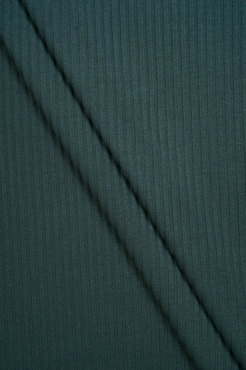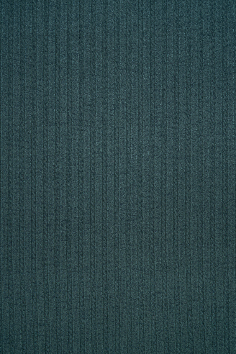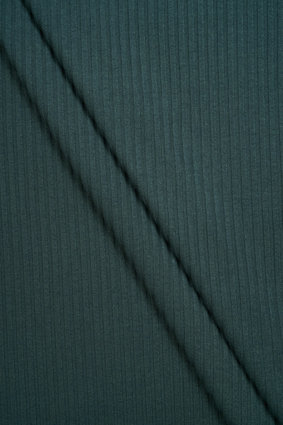 Talianska pletenina so širokou rebrovou väzbou (0,5 cm) v zelenej farbe. Pletená látka je mäkká, veľmi elastická, nepriehľadná, príjemná na dotyk.