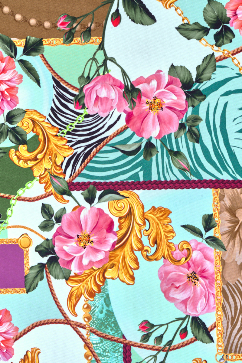 Talianska, hrubá a mäsitá viskózová pletenina s farebným, patchworkovým veľkým vzorom. Tkanina pre ľudí, ktorí chcú mať všetko naraz - veľké kvety (od 9-13 cm), orientálne motívy, zebra vrecovina, reťaze a šperky.