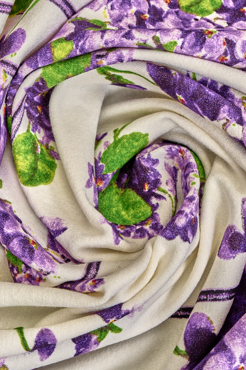 Talianska viskózová džersejová pletenina s motívom drobných, fialových kvetov, zlatých podkov a pruhov na krémovom pozadí. Vzor je hustý a kvety tvoria kytice zdobené zelenými listami. Úplet je nepriehľadný s hustou väzbou, elastický, jemne riasený a mäsitý. Ideálne na šaty, nohavice, bundy a mikiny.