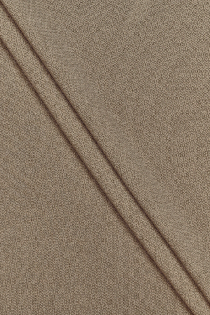 Taliansky polyesterový úplet v tmavej kamennej béžovej farbe. Pletenina je obojstranná - jedna strana má jemnú zvlnenú štruktúru, druhá hladkú väzbu. Materiál je mäsitý, elastický, matný a mäkký. Bude dobre fungovať pri šití šiat, sukne, ale aj nohavíc či mikiny.