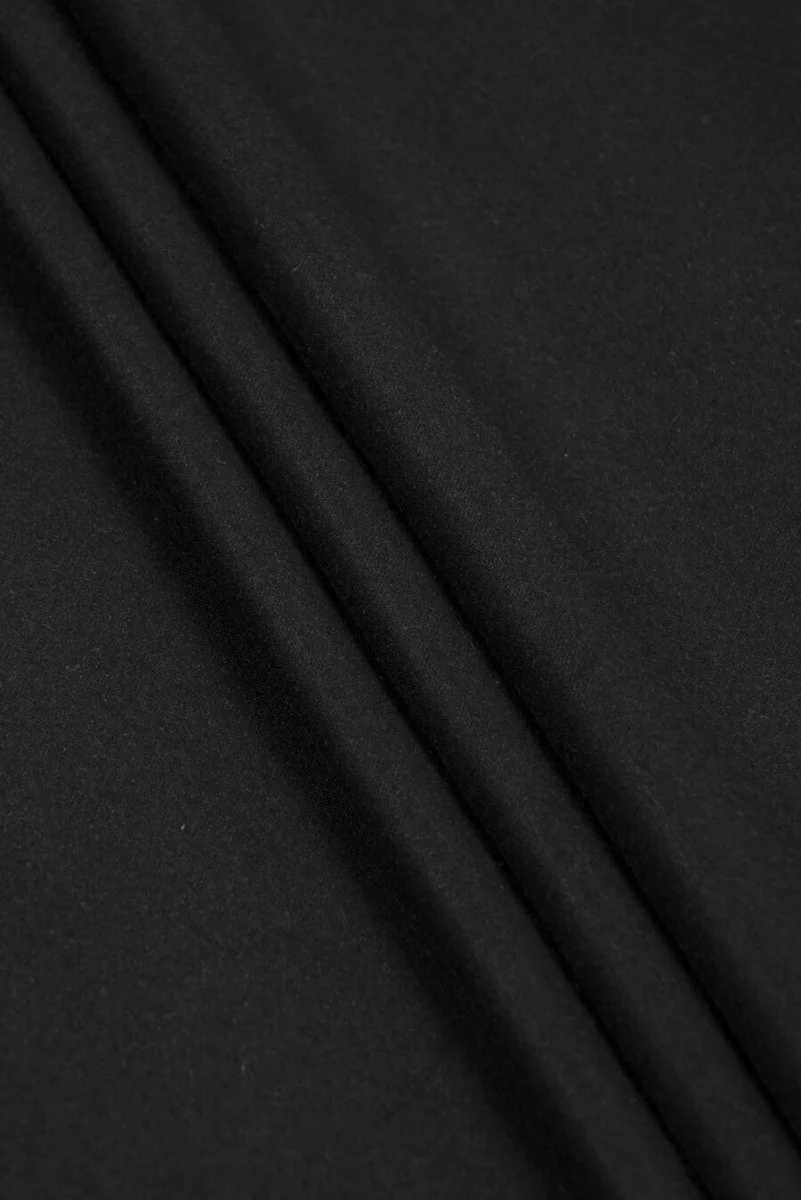 Taliansky bavlnený džersej s prídavkom polyesteru a elastanu v čiernej farbe. Pletenina s pevnou väzbou, strednej hrúbky, matná a elastická. Je ideálny na šitie každodenného oblečenia, ako sú šaty, sukne, tuniky alebo ľahké mikiny.