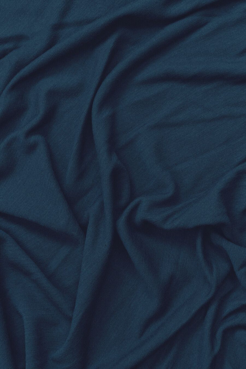 Taliansky vlnený dres s prídavkom polyamidu a elastanu v tmavomodrej farbe. Pletenina s pevnou väzbou, strednej hrúbky, matná a elastická. Je ideálny na šitie každodenného oblečenia, ako sú šaty, sukne, tuniky, blúzky, ale aj ľahké svetre alebo vesty.