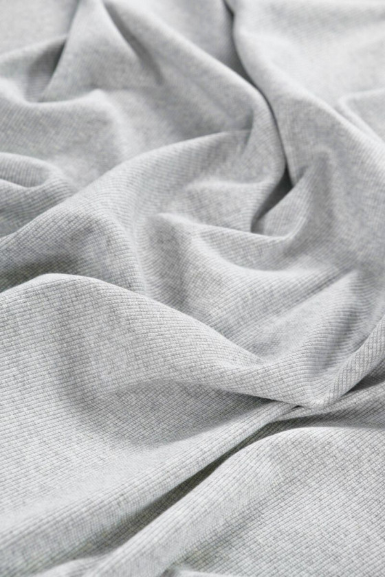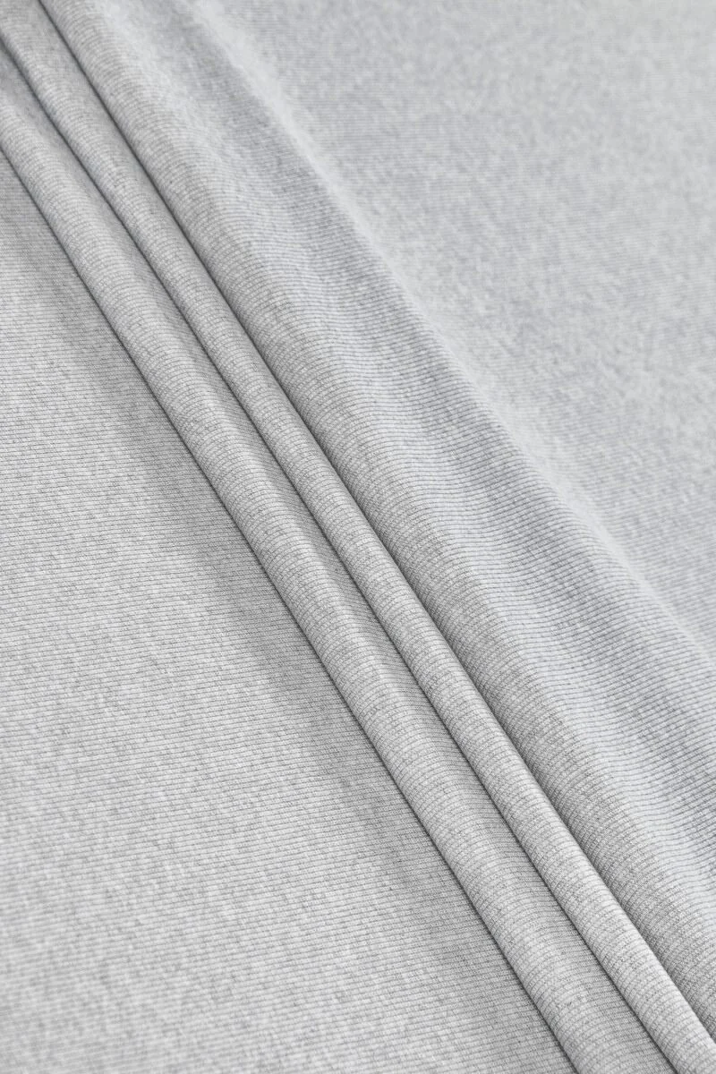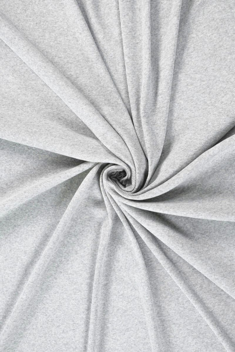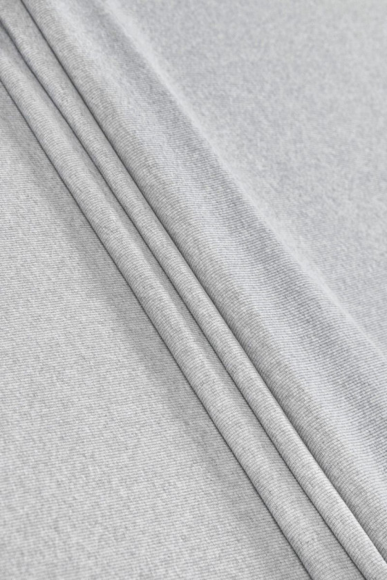 Taliansky viskózový úplet v svetlosivej farbe, široký 90 cm. Látka s charakteristickou rebrovanou väzbou pripomínajúcou lem.