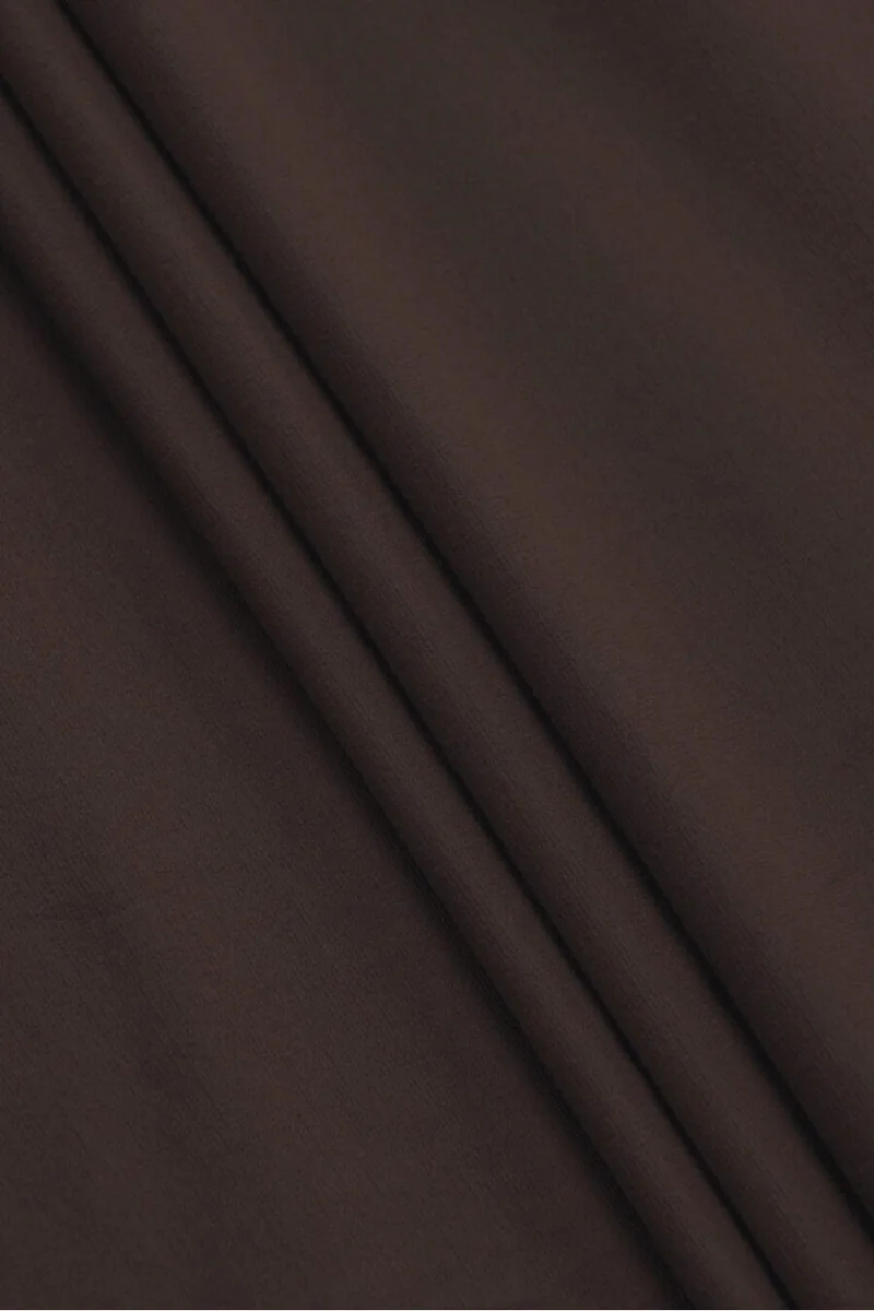 Taliansky polyesterový džersejový úplet v tmavohnedej farbe. Úplet s pevnou väzbou, strednej hrúbky, matný a elastický. Je ideálny na šitie každodenného oblečenia, ako sú šaty, sukne, tuniky alebo ľahké mikiny.