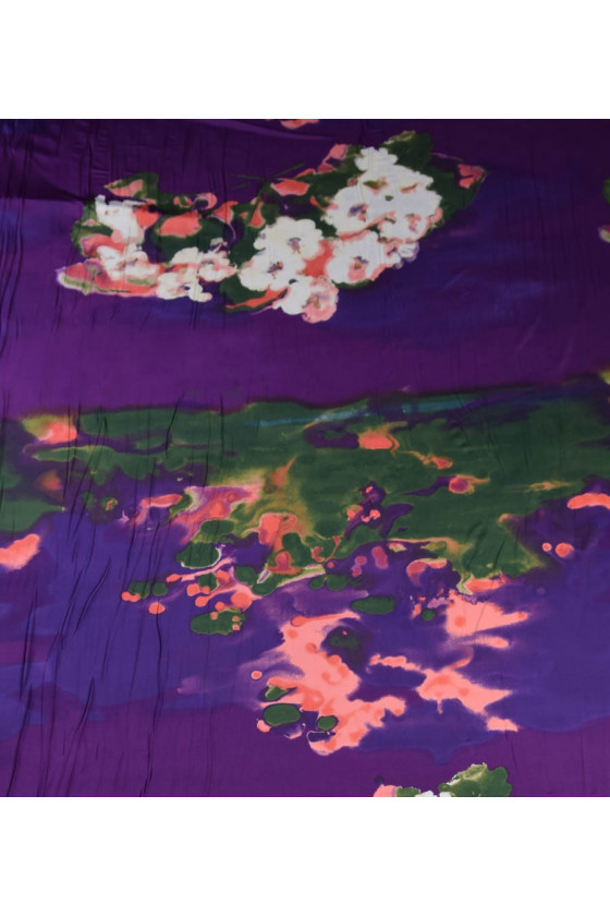 Talianska viskózová pletenina vo fialovej farbe s kvetinovým motívom, látka sa dodáva vo veľkosti kupónu 115 cm * 140 cm. Pletenina klzkého chladiaceho typu.