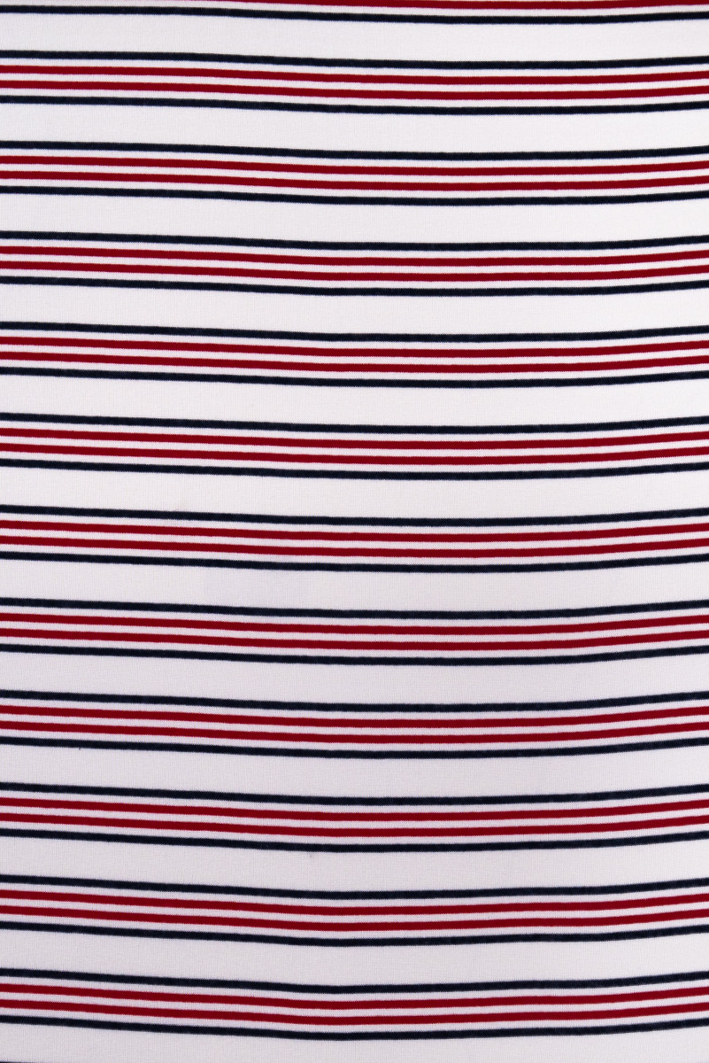 Talianska viskózová pletenina s červenými a námorníckymi modrými pruhmi na krémovom pozadí. Viskózový úplet je prírodná tkanina (získaná z celulózy), veľmi mäkká, vzdušná, prídavok elastanu ju robí odolnejšou a odolnejšou.