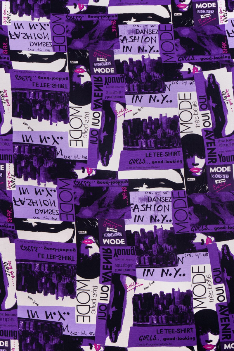 Viskózový elastický úplet s motívom "novín" v čiernej a fialovej farbe s bielymi prvkami.