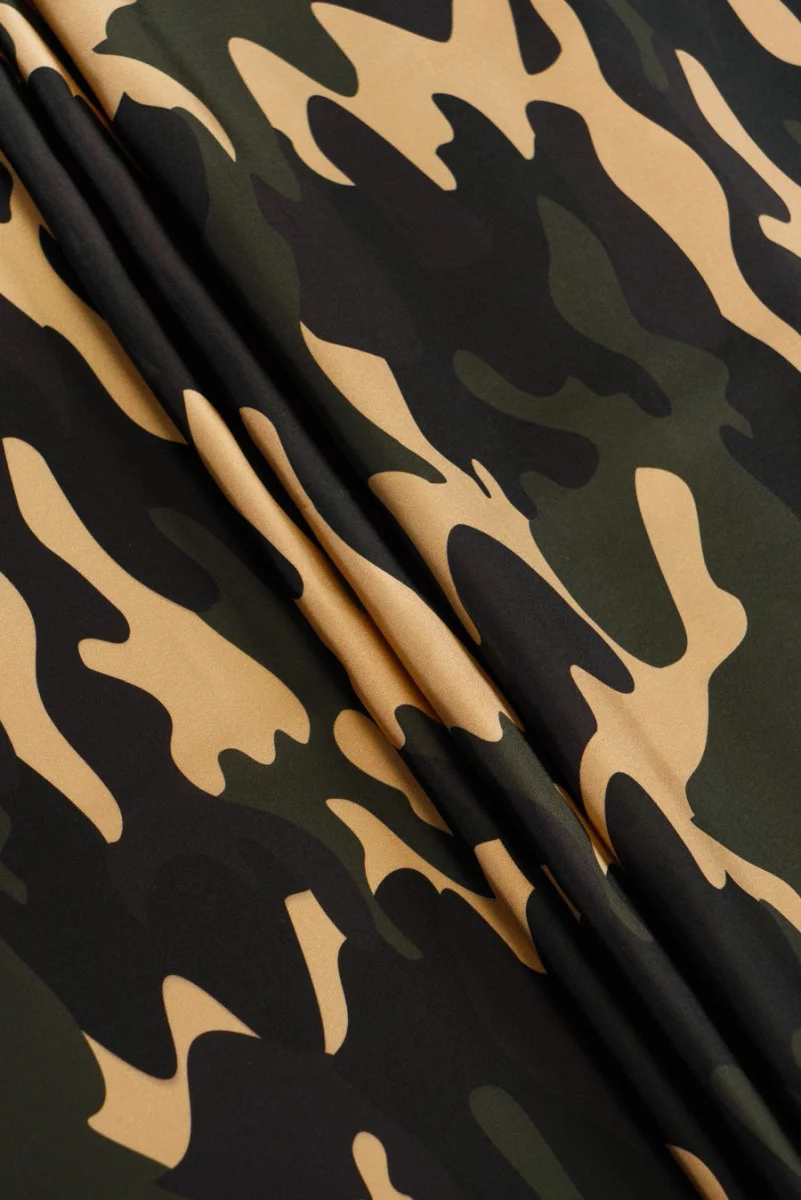 Taliansky polyesterový satén s motívom kamufláže v čiernej, béžovej a khaki. Neelastická, ľahká tkanina s charakteristickým leskom. Ideálne na šitie blúzky, šiat, sukne.