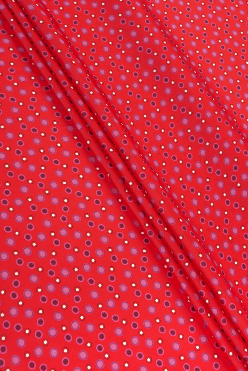 Taliansky polyesterový satén s malými, nepravidelnými bodkami (1 cm) v ružovej a fialovej farbe na malinovočervenom pozadí. Polyesterový satén je zamatová tkanina s jemným leskom. Na rozdiel od prírodných tkanín sa nekrčí a je odolnejší. Ideálne na šitie šiat, blúzky, košele, sukne alebo šálu.