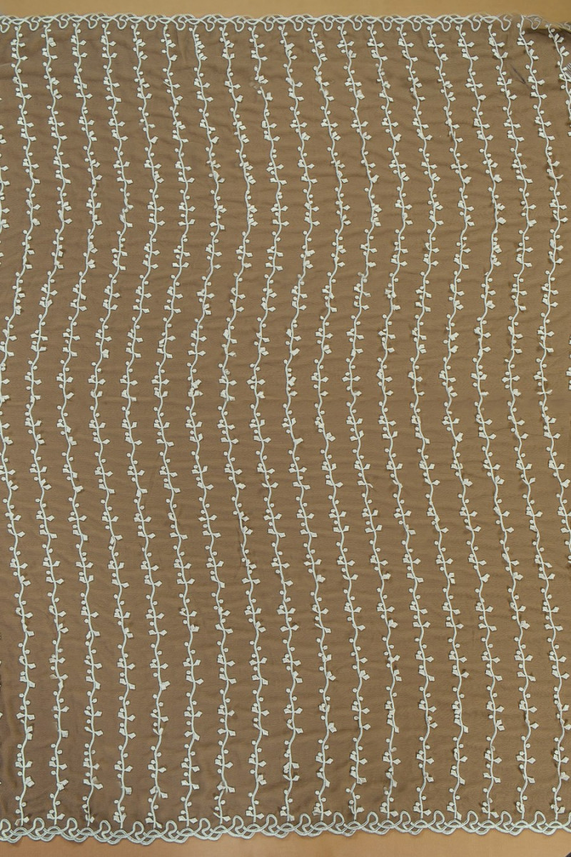 Talianska večerná látka - šifón v tmavých olivových farbách (dvojfarebná čierna/olivová) s krásnou guipure výšivkou v ecru farbe. Zaujímavý motív vetvičiek usporiadaných do zvislých pruhov každých 5 cm. Látka je z oboch strán zakončená ozdobným hrotom.