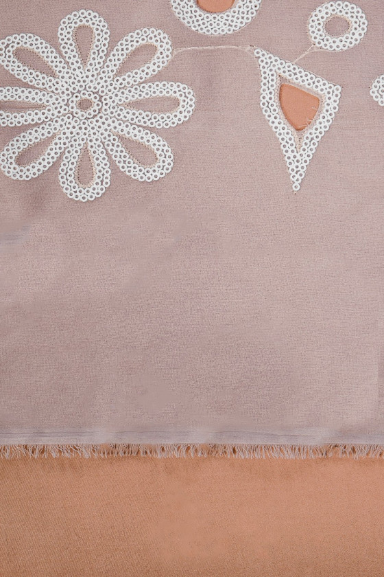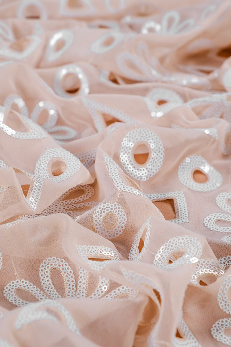 Taliansky polyesterový šifón vo svetlobéžovej farbe. Látka s motívom laserom rezaných, geometrických vzorov a kvetinového motívu, krásne zdobená flitrami perleťovej farby. Ľahká, vzdušná, priehľadná tkanina - ideálna na šitie šiat, sukne alebo blúzky.