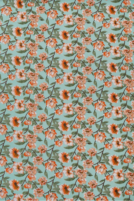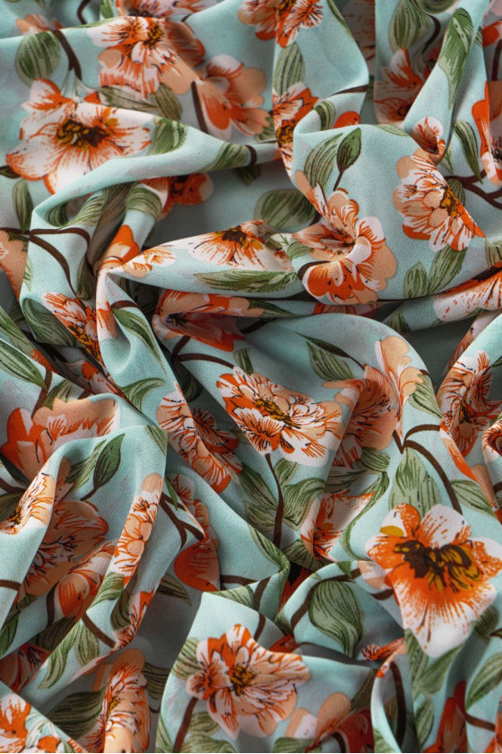 Talianska, tenká polyesterová georgette - mäta s oranžovými kvetmi.