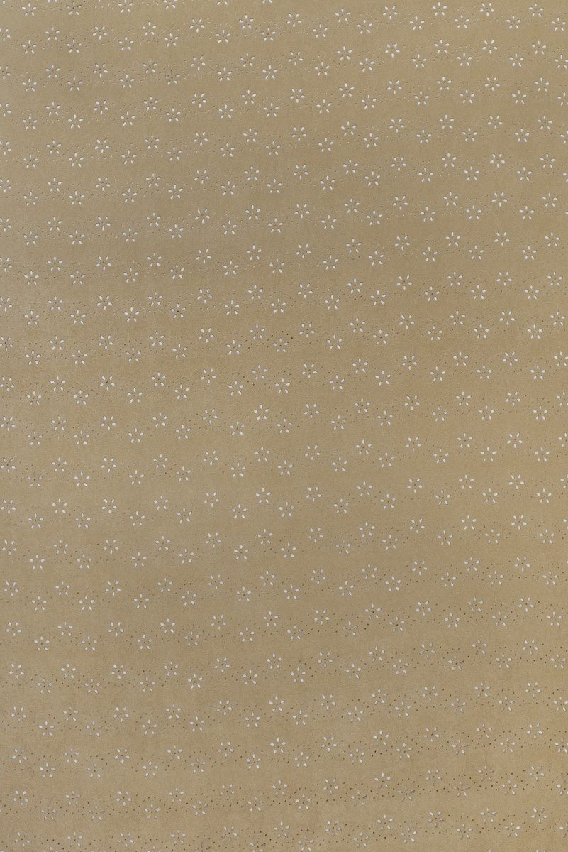 Talianska alcantara tkanina v béžovej farbe s laserom rezanými kvetmi. Alcantara je syntetická tkanina vyrobená z mikrovlákna (mikrovlákna, až 20-krát jemnejšie ako ľudský vlas), vyzerá a pôsobí ako semiš.