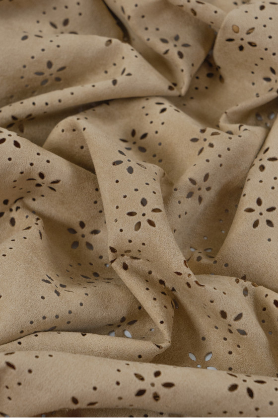 Talianska alcantara tkanina v béžovej farbe s laserom rezanými kvetmi. Alcantara je syntetická tkanina vyrobená z mikrovlákna (mikrovlákna, až 20-krát jemnejšie ako ľudský vlas), vyzerá a pôsobí ako semiš. Mäkká, tenká, neelastická, nepriehľadná tkanina. Ideálne na šitie šiat, sukne, vesty, tenkej bundy.