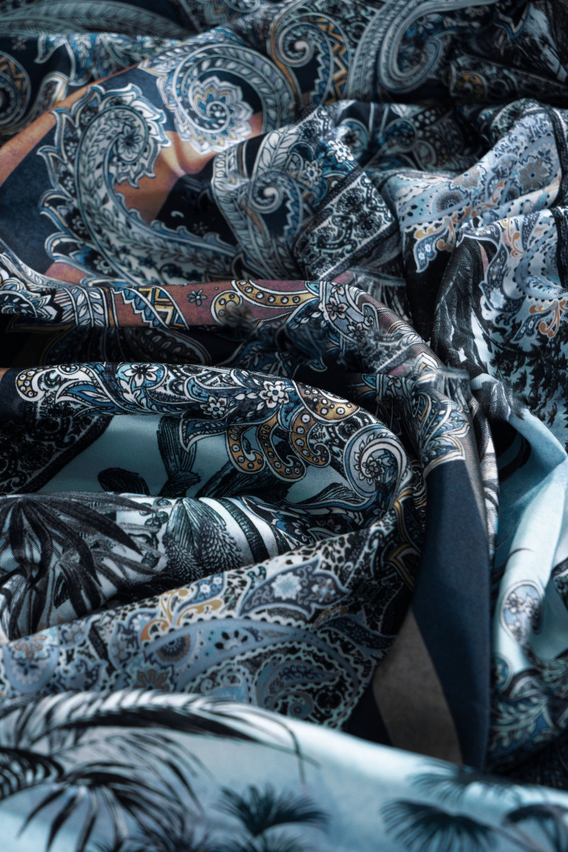 Talianska polyesterová keprová tkanina s orientálnymi motívmi v odtieňoch námorníckej modrej a hnedej. Keprová je tkanina s keprovou väzbou, mäkká, veľmi odolná, jemne tuhá. Perfektné na šitie košele, šiat, sukne alebo šálu/šatky.