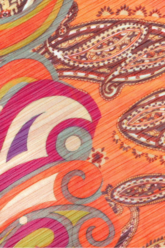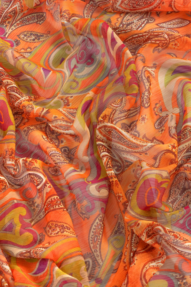 Taliansky polyesterový šifón (pokrčený) s orientálnym motívom v červenej a oranžovej farbe. Pokrčený šifón je veľmi jemná, vzdušná, priehľadná tkanina s mierne "pokrčenou" štruktúrou.