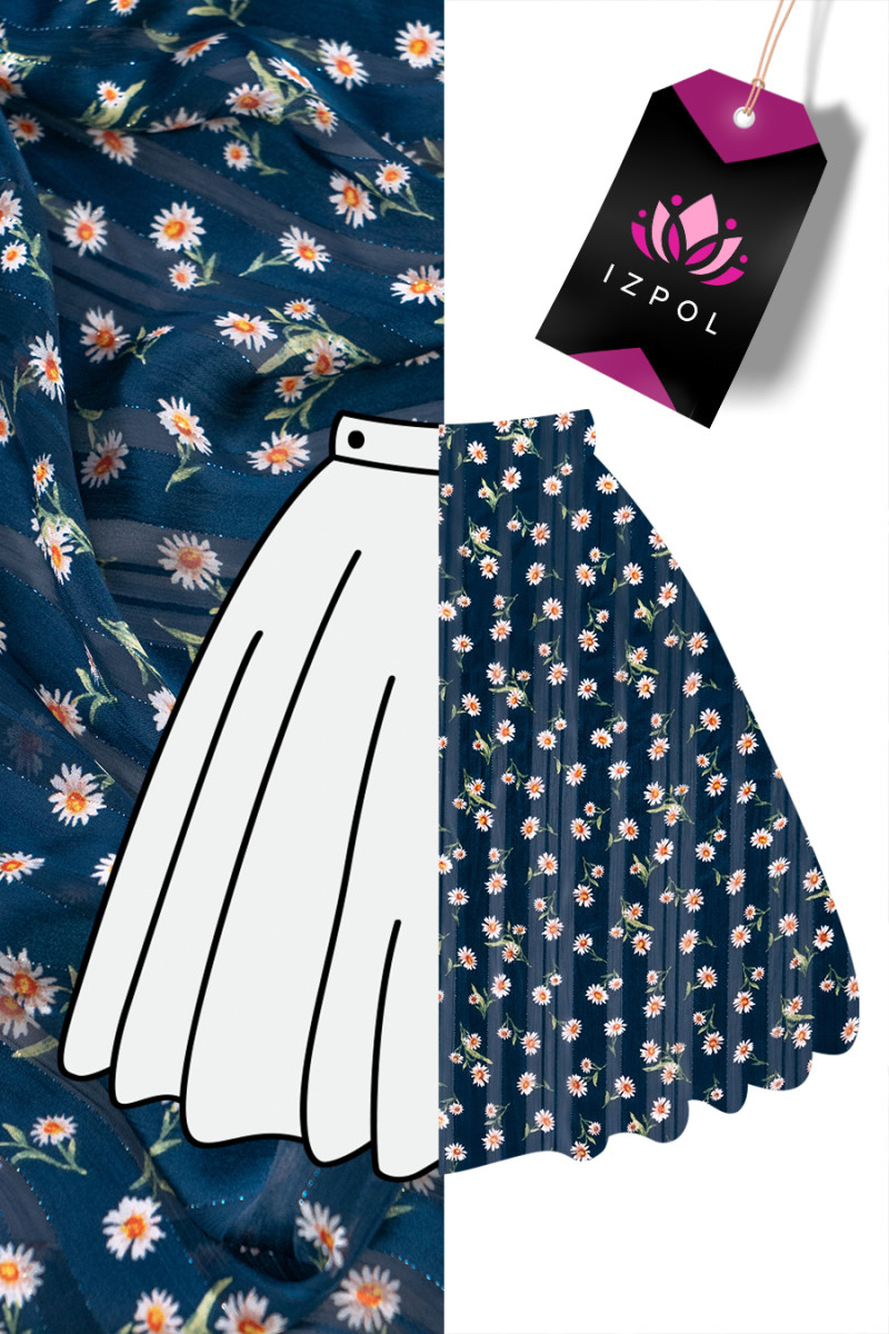 Taliansky polyesterový šifón druhu devore v námorníckej modrej farbe s motívom malých kvetov (lúka). Tkanina devore je kombináciou šifónu s dodatočnými saténovými pruhmi. Tkanina je tenká, priehľadná, neelastická, veľmi jemná. Ideálne na šitie vzdušnej blúzky, sukne, šiat alebo šálu.