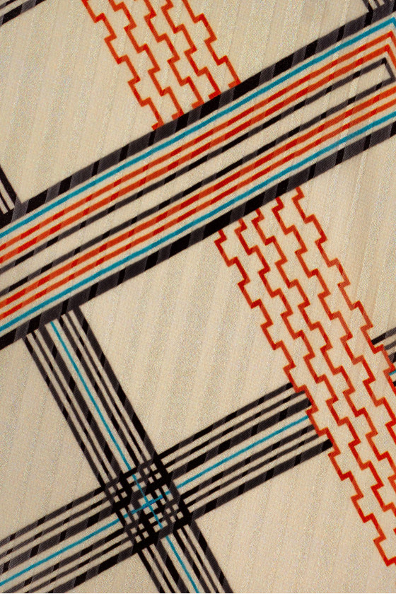 Taliansky devore polyesterový šifón v béžovej farbe s čierno-červeno-modrým keprovým motívom (19 cm). Tkanina devore je kombináciou šifónu s dodatočnými saténovými pruhmi.