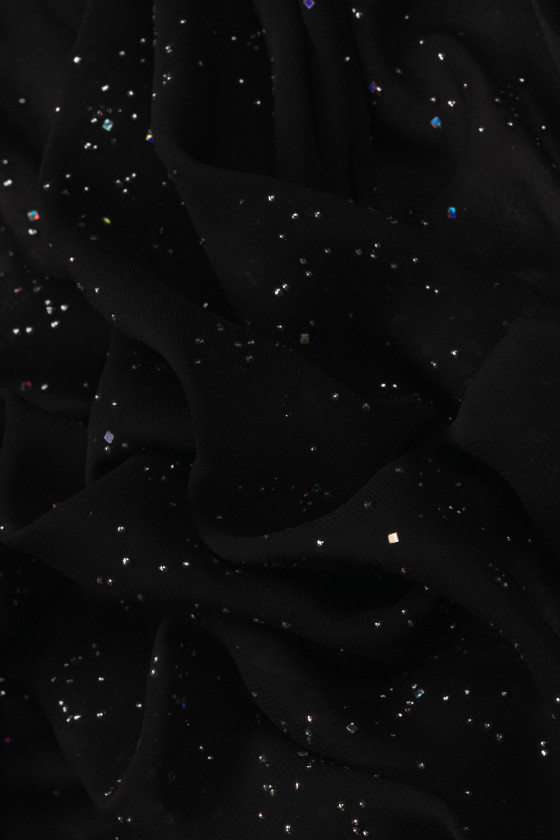 Taliansky polyesterový šifón v čiernej farbe s farebnými, malými ozdobami. Tenká, priehľadná, mäkká a neelastická tkanina - ideálna na šitie šiat, blúzky, sukne alebo šálu.