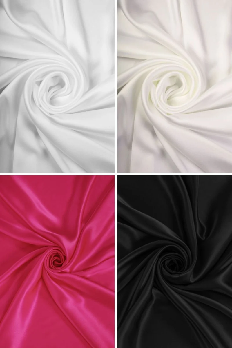 Polyesterový satén v rôznych farbách, mäsitý, splývavý, krásne zakrytý. Vyberte farbu z palety farieb. Odporúčame na šitie šiat, sukní, blúzok