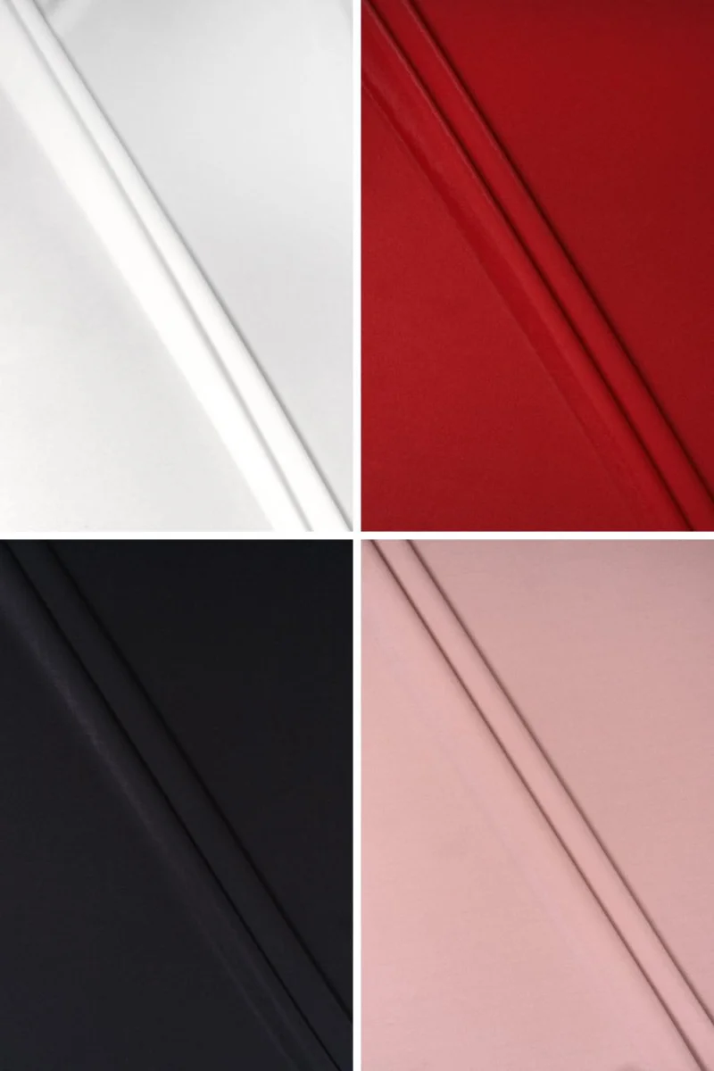 Talianske cadi šaty tkanina v základnej škále farieb. Tkanina je veľmi elastická, mäsitá s kompaktnou väzbou. Má jemnú, zrnitú štruktúru a jemný strieborný lesk. To mu dáva elegantnejší vzhľad. Je ideálny na šitie šiat alebo sukne.