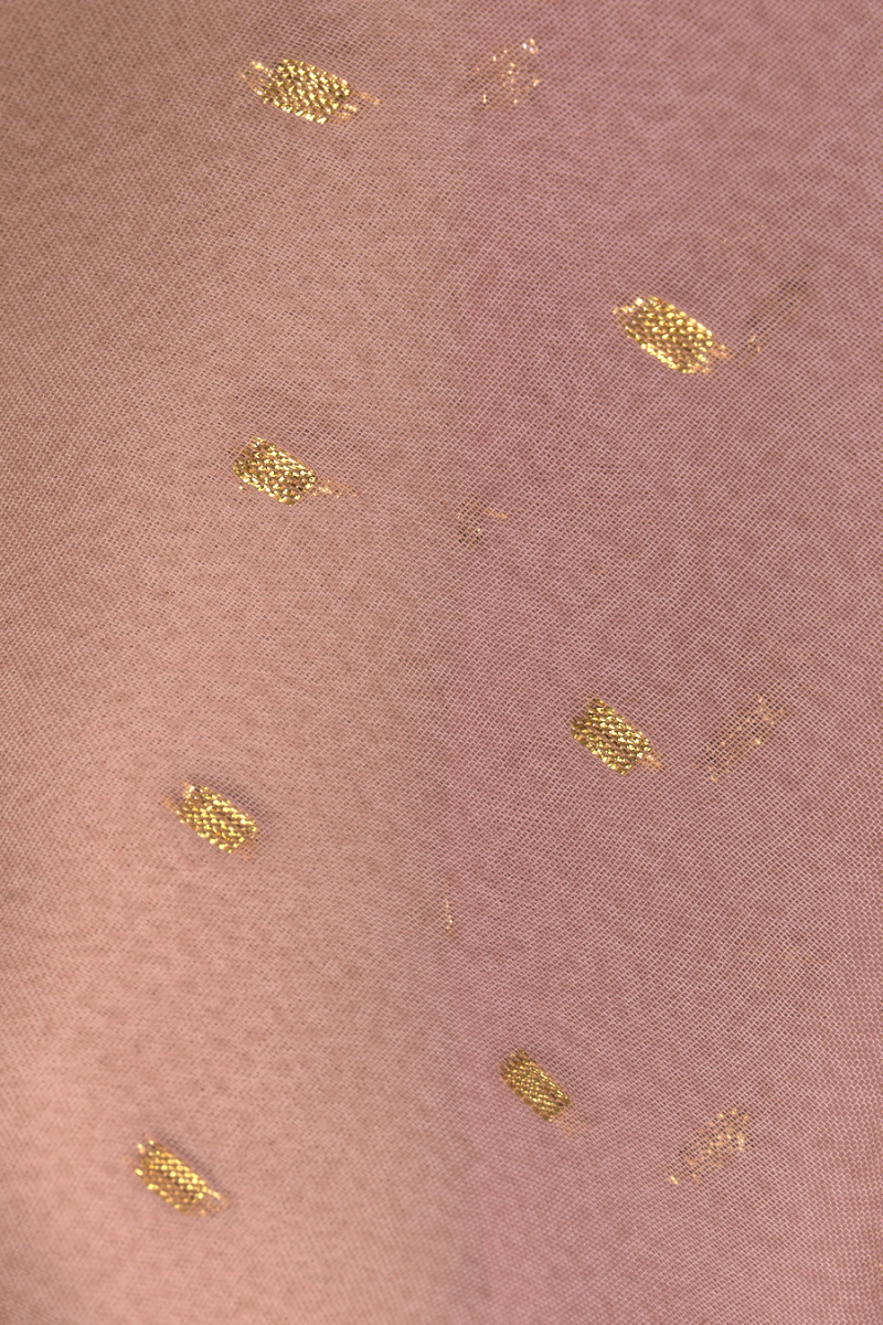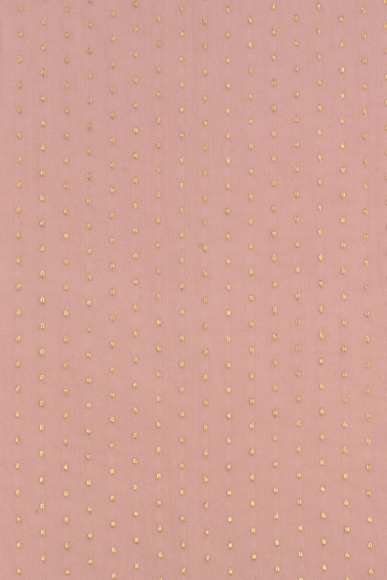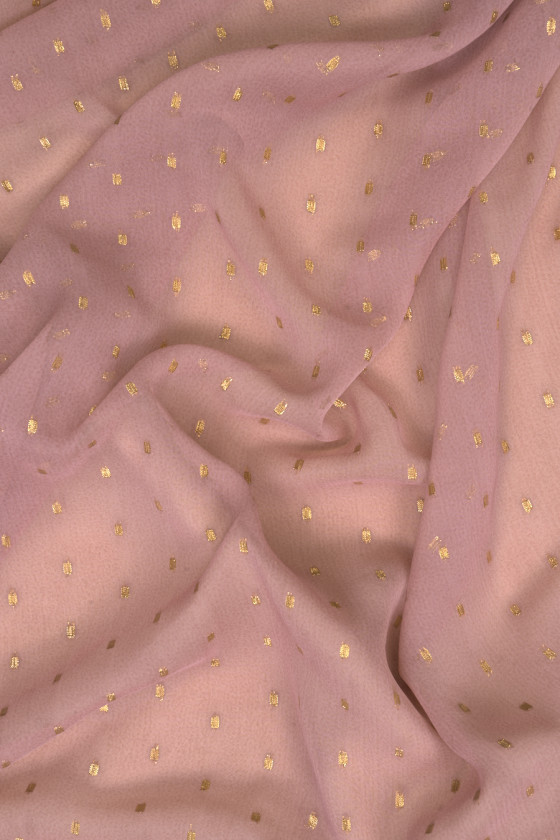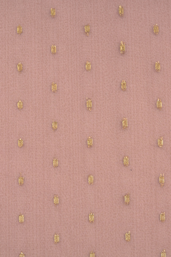 Taliansky polyesterový šifón v špinavej ružovej farbe s motívom malých, geometrických vzorov zo zlatej lurexovej nite. Látka je tenká a splývavá, takže je ideálna na šitie vzdušných šiat, blúzky alebo šálu. Fantastický návrh pre fanúšikov tlmených, mierne lesklých tkanín.