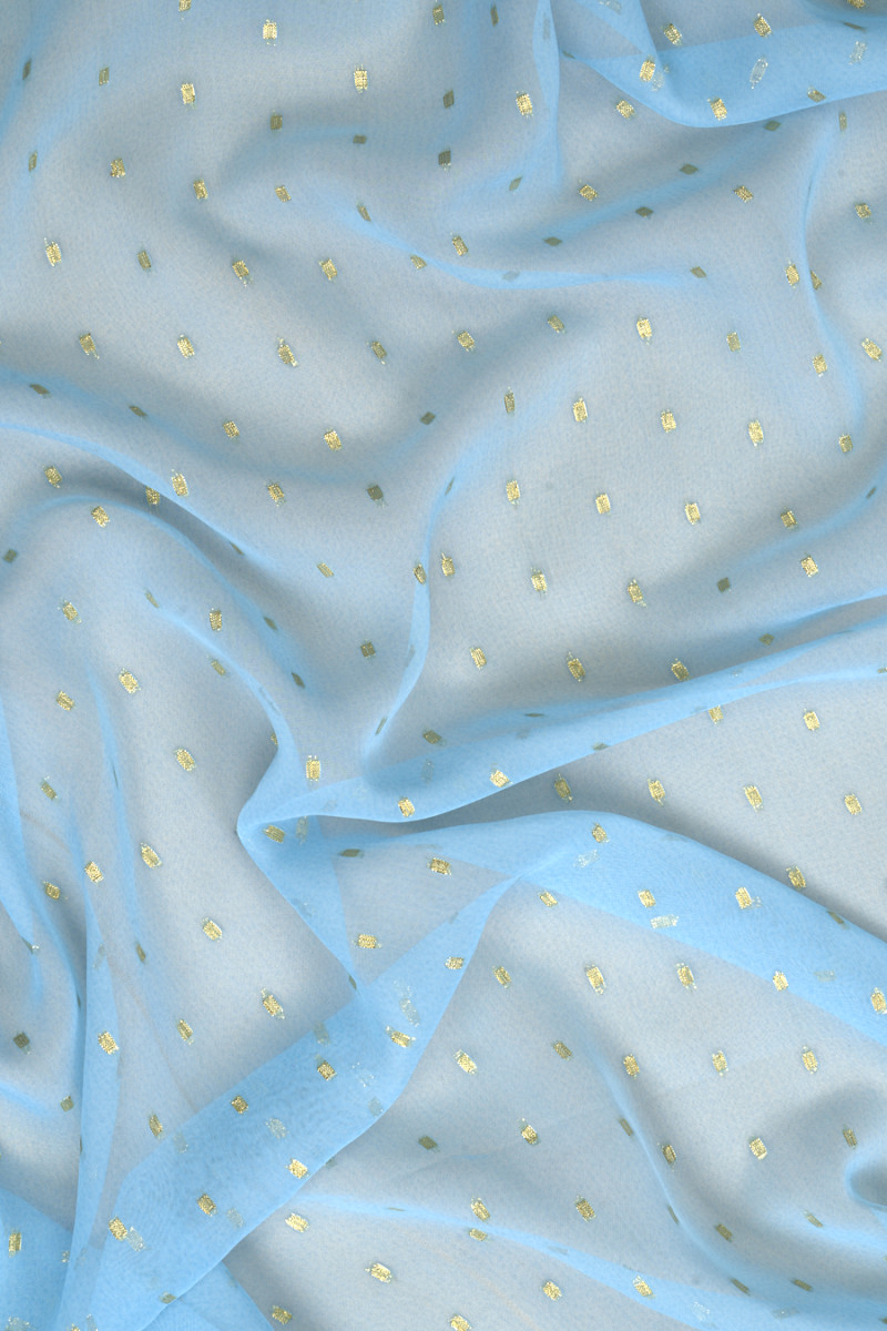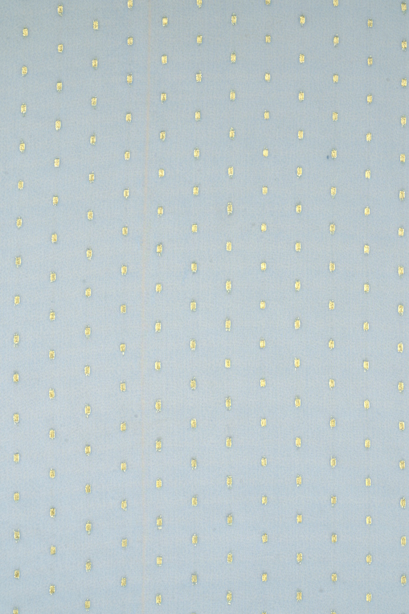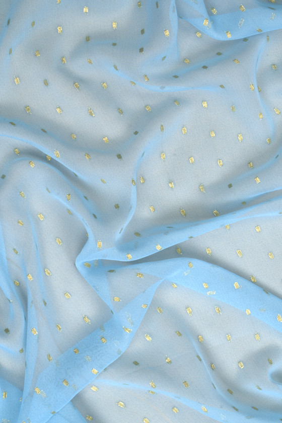 Taliansky modrý polyesterový šifón s motívom malých, geometrických vzorov zo zlatej lurexovej nite. Látka je tenká a splývavá, takže je ideálna na šitie vzdušných šiat, blúzky alebo šálu. Fantastický návrh pre fanúšikov ľahkých, mierne lesklých tkanín.