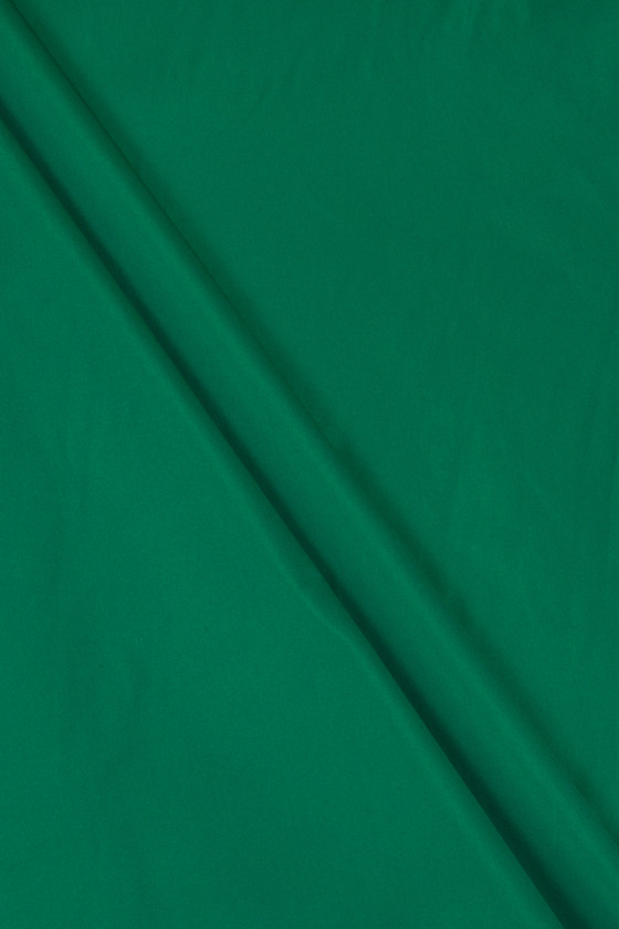 Talianska polyesterová taftová tkanina v tmavšej zelenej farbe. Látka je tenká, ale tuhá, mierne lesklá.