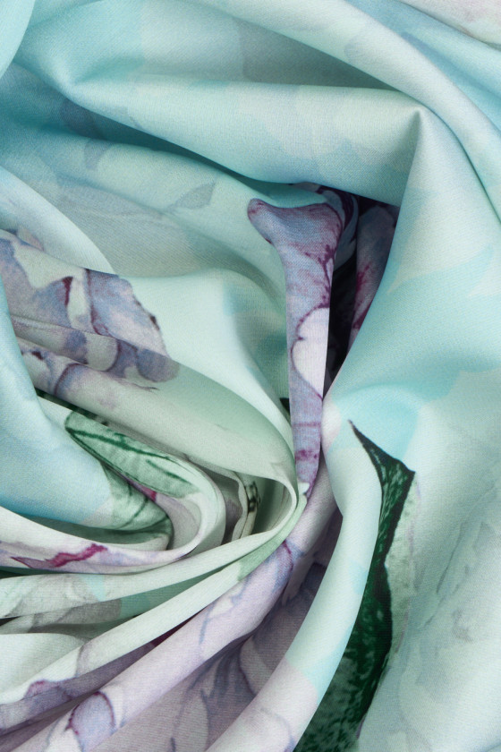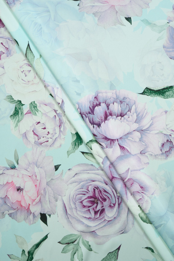Taliansky polyesterový satén s motívom veľkých pivoniek na svetlotyrkysovom pozadí. Vzor je vyrobený v jemných, pastelových farbách. Látka je vzdušná, ľahká, s hladkou saténovou väzbou, jemná a príjemná na dotyk. Romantický návrh pre ľudí, ktorí majú radi kvetinové vzory. Látka je ideálna na šitie vzdušných šiat, sukne, blúzky a košele.