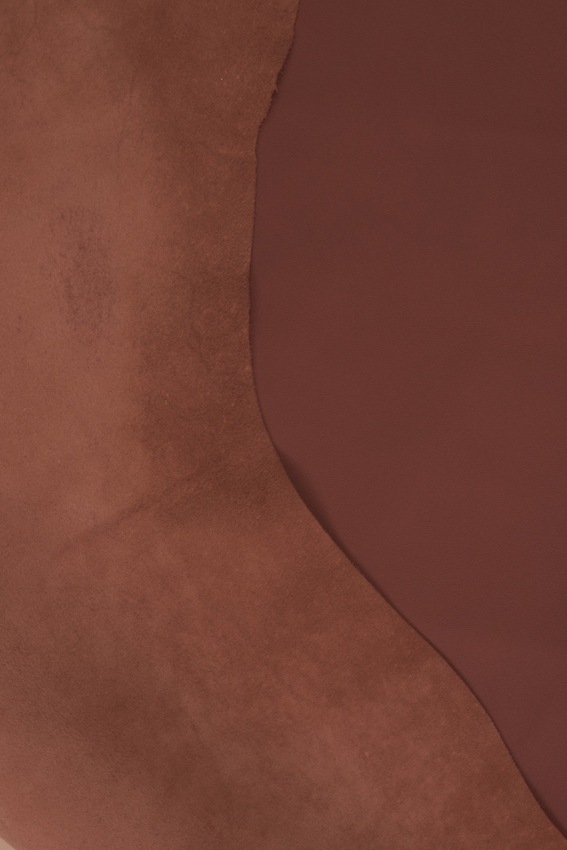 Talianska prírodná koža dyhovaná v tehlovo hnedej farbe. Teľacia koža s hladkým povrchom a strednou hrúbkou. Je ideálny na šitie saka, kabáta, sukne alebo šiat.