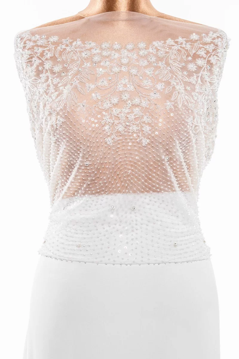 Talianska svadobná aplikácia vo forme korzetu (blúzka - predná) v krémovej farbe. Vrch nášivky zdobia malé kvety z korálikov a flitrov, ktoré sa jemne menia na husto tkané malé korálky. Celok je našitý na mäkkom tyle. Aplikácia je ideálna pre svadobné šaty, večerné šaty alebo blúzku.