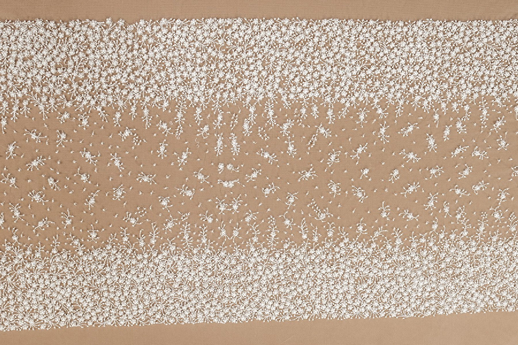 Talianska svadobná aplikácia vo forme korzetu krémovej farby. Motív malých kvetov zo svetlých korálkov. Vzor je v strede riedky a smerom k okrajom hustne. Rozmery: šírka 110 cm, výška 40 cm.