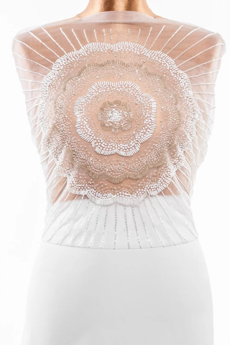 Talianska svadobná aplikácia vo forme korzetu (blúzka - predná) v krémovej farbe. Malé, priehľadné guľôčky vytvárajú vzor pripomínajúci slnečné lúče. V strede nášivky je veľký kvet (27 cm) z bielych flitrov a perleťových a priehľadných korálikov. Celok je našitý na mäkkom tyle. Aplikácia je ideálna pre svadobné alebo večerné šaty.
