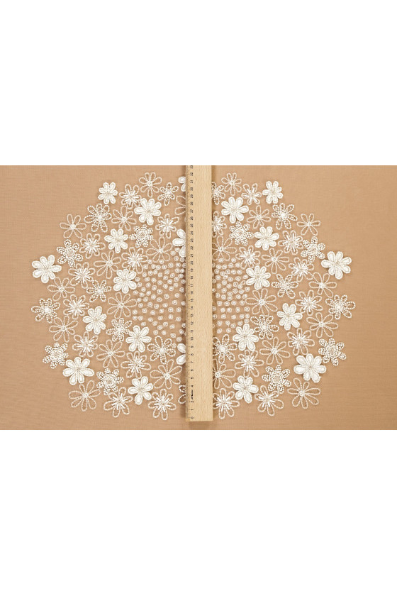 Talianska svadobná aplikácia v krémovej farbe. Krásny motív malých kvetov (3 cm) z korálkov a perál, v stredovom bode sú malé geometrické motívy. Rozmery aplikácie: šírka 40 cm, výška 30 cm.