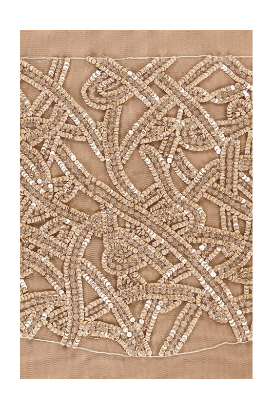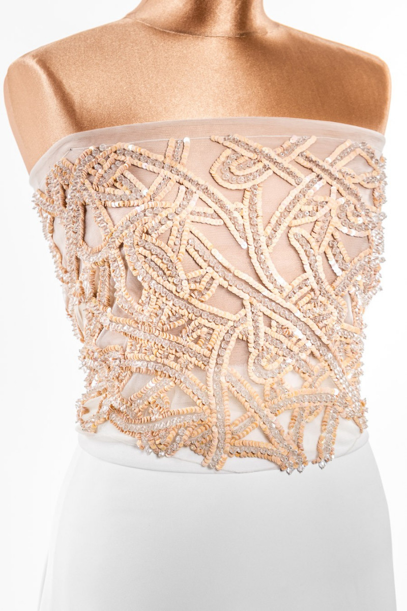 Talianska aplikácia vo forme korzetu (vpredu). Krásny, efektný vzor z flitrov marhuľovej farby a veľkých, priehľadných korálkov. Celok je našitý na mäkkej tylovej sieťovine krémovej farby.