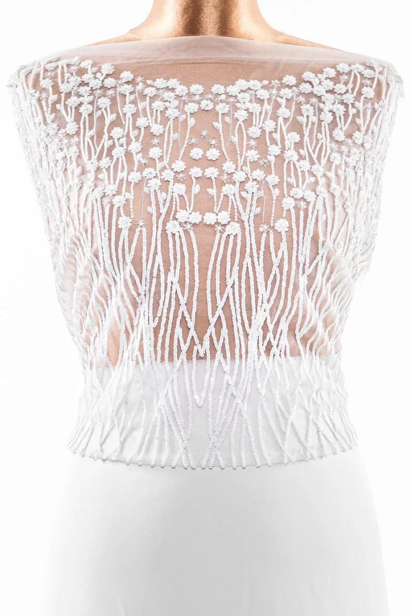 Talianska aplikácia vo forme korzetu (blúzka - predná) v bielej farbe - husto zdobená malými kvetmi z bielych a priehľadných korálkov a flitrov. Celok je našitý na mäkkej tylovej sieťovine krémovej farby.