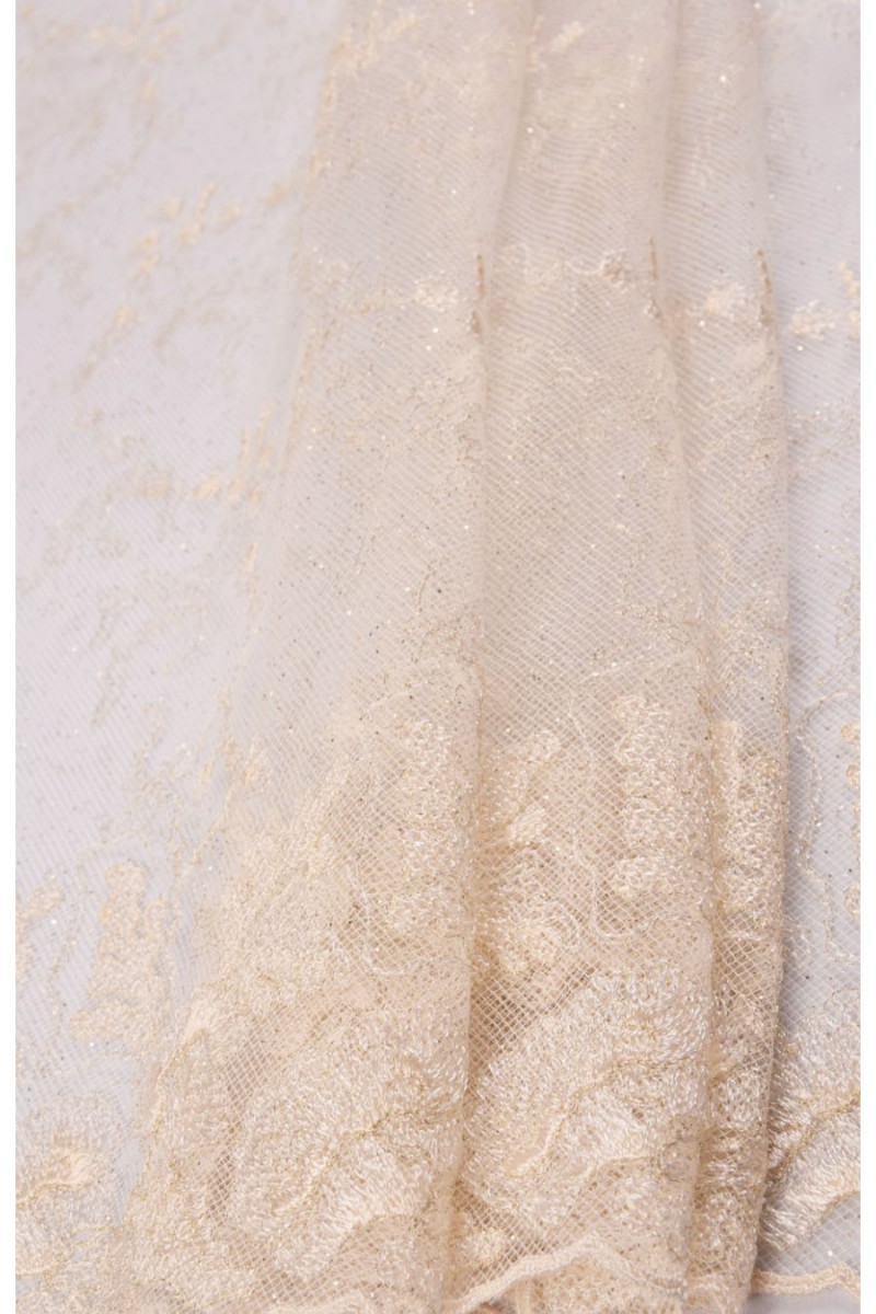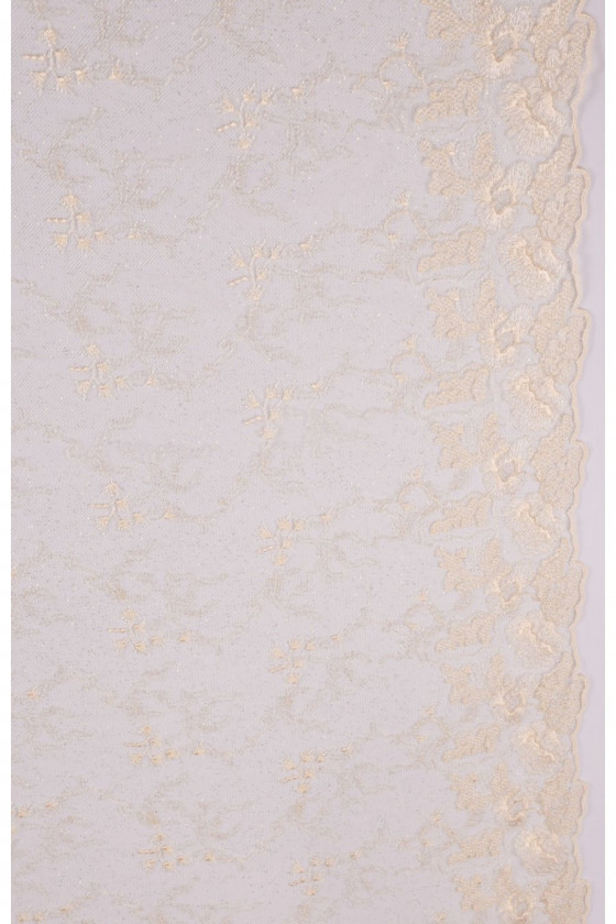 Francúzska svadobná čipka s jemným, klasickým ecru vzorom, zakončená z oboch strán ozdobným zubom. Čipka je jemne zdobená lurexovou niťou a trblietkami (nespadne), vďaka čomu krásne iskrí.