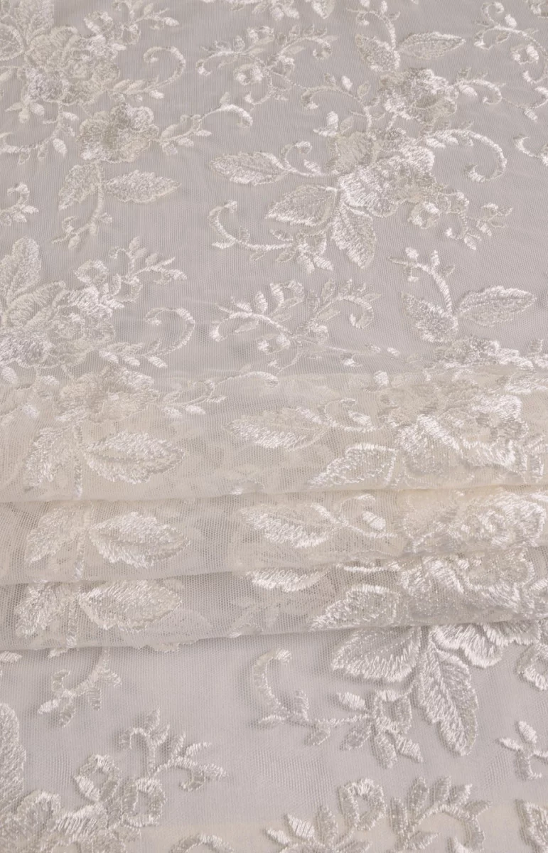Ecru čipka vyšívaná kvetinovým vzorom. Koruna je široká 35 cm a na oboch stranách je ukončená ozdobným zubom. Látka mäkká na dotyk. Odporúčame ho na dokončenie elegantných spoločenských a svadobných outfitov.