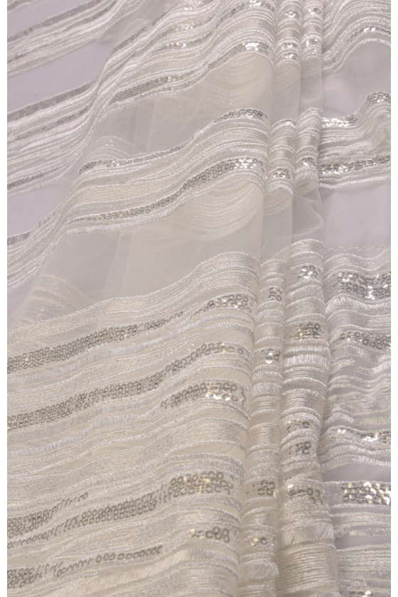 Svadobná čipka vyšívaná originálnym vzorom veľkých pruhov (od 10-22 cm), ku ktorým sú prišité strieborné flitre, vďaka ktorým sa látka diskrétne leskne. Konštrukcia je stredne tuhá. Farba – biela krémová