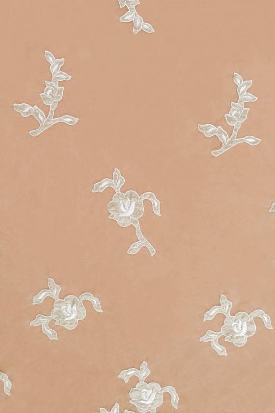 Svadobná čipka s našitými saténovou kvetinovou aplikáciou 15-20 cm v ecru farbe. Korunka nie je zakončená ozdobným zubom. Kvety je možné vystrihnúť a prišiť na inú látku. Látka je ideálna na šitie svadobných šiat alebo elegantnej blúzky.