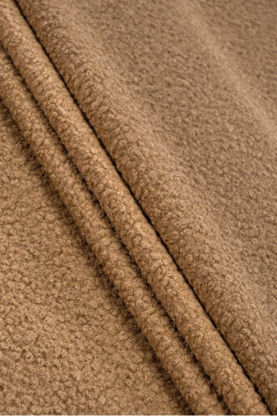 Talianska boucle kabátová tkanina v ťavej farbe. Hrubšia, mäsitá tkanina s charakteristickou textúrou - ideálna na šitie kabáta, bundy alebo vesty.