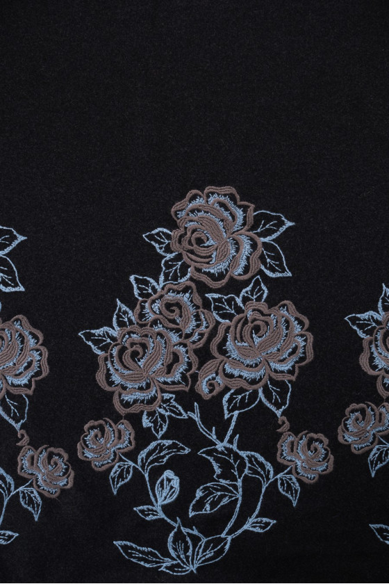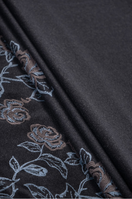 Talianska kabátová látka s kvetinovým motívom v modro-béžovej farbe na grafitovom podklade. Tkané zo 100% prírodnej vlny. Látka je šitá po obvode.