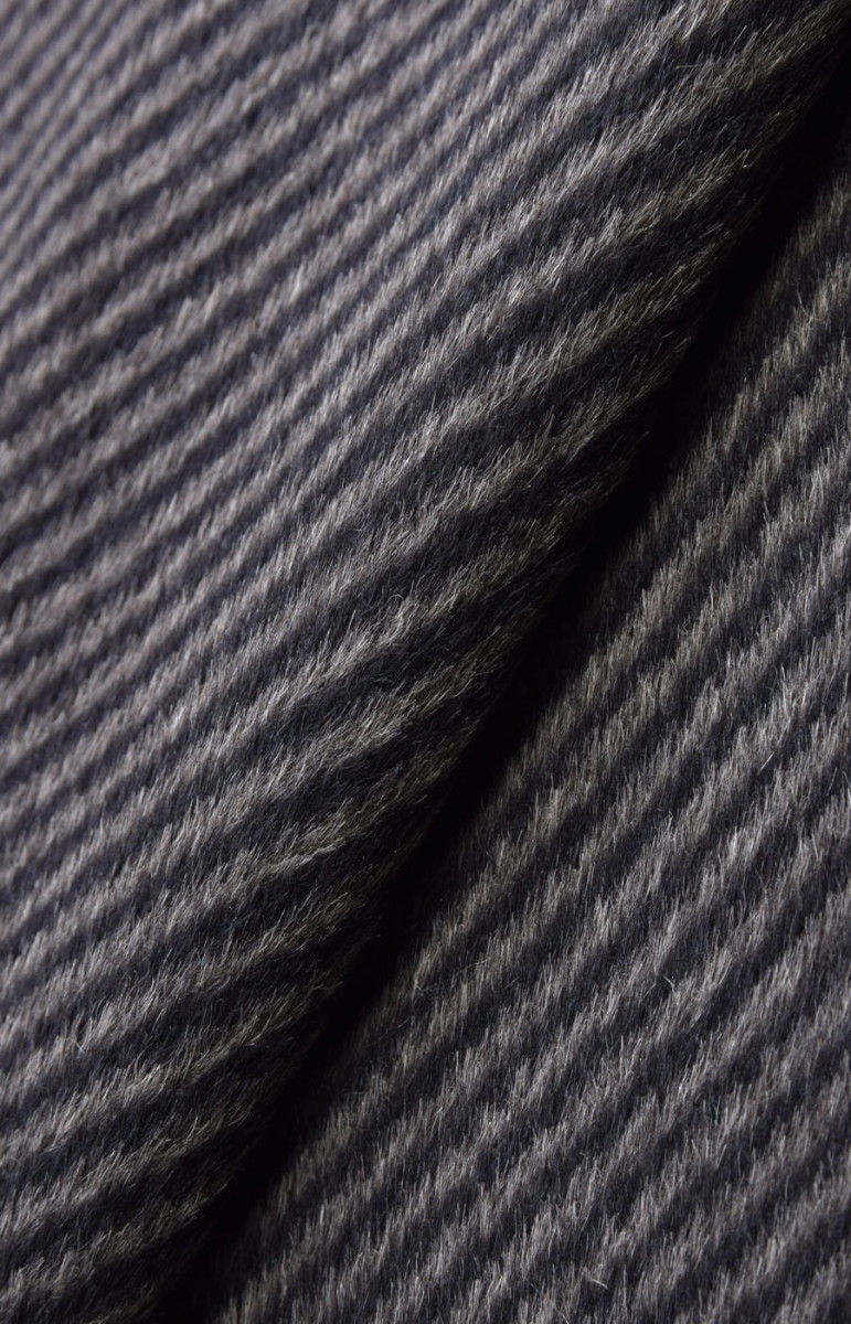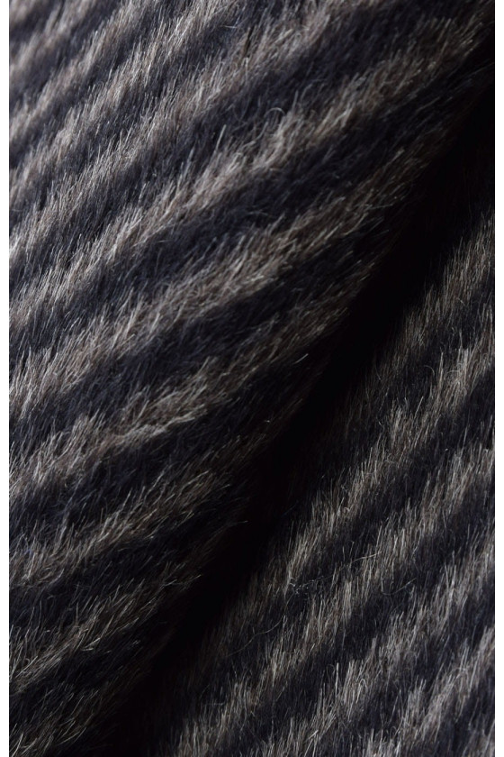 Talianska kabát s malými pruhmi v hnedej a šedej farbe, tkaná z alpaky s prímesou kašmíru. Tkanina s obsahom vlny z alpaky má vynikajúcu priedušnosť a izolačné vlastnosti, má dlhší vlas a je veľmi mäkká. Ideálne na šitie kabáta, bundy, vesty.