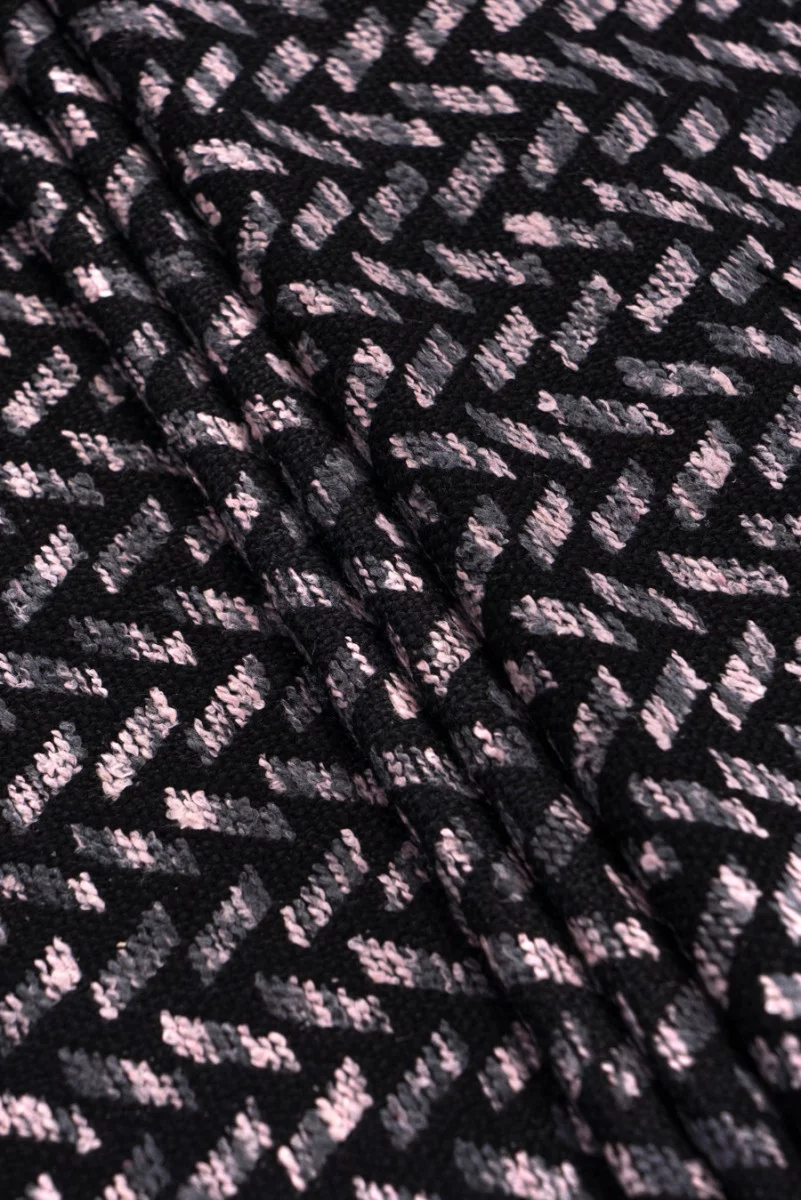 Talianska, hrubšia svetrová látka s pevnou väzbou a geometrickým vzorom v čiernej, šedej a ružovej farbe. Mäkká, mäsitá látka ideálna na šitie hrubšieho svetra alebo tenkého kabáta.