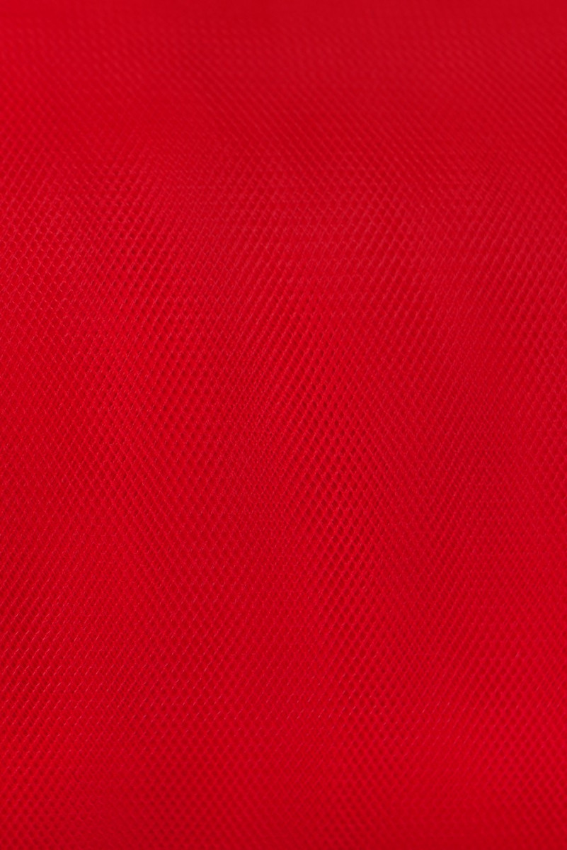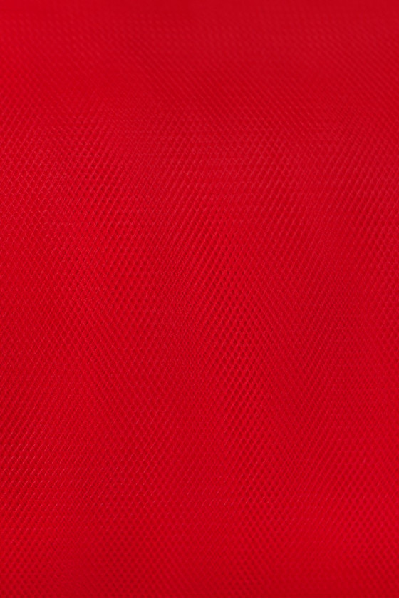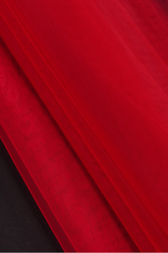 Mäkký tyl v červenej farbe, tkaný vo veľmi malých okách, jemný, elastický na jednu stranu. Šírka 280 cm.