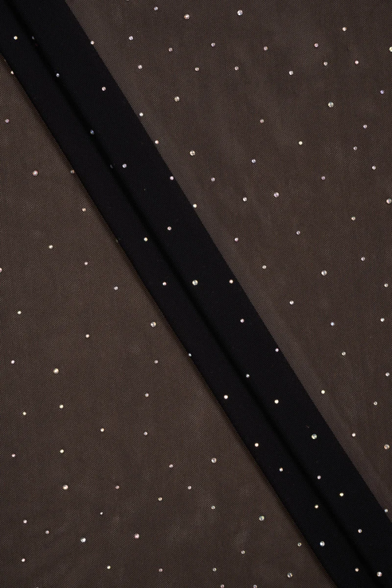 Talianska elastická sieťovina v oboch smeroch v čiernej farbe s lepeným viacfarebným zirkónom. Tenká, priehľadná, mäkká, elastická látka - ideálna na šitie večernej blúzky, šiat, sukne alebo na konečnú úpravu.