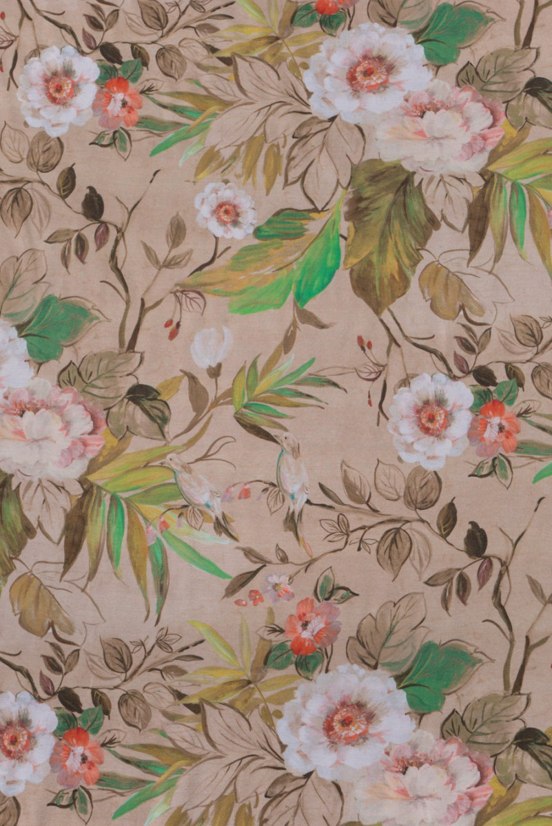 Talianska viskózová tkanina veľmi dobrej kvality. Kvetinový motív na béžovom podklade. Farby: béžová, zelená, biela, khaki, oranžová, hnedá.
